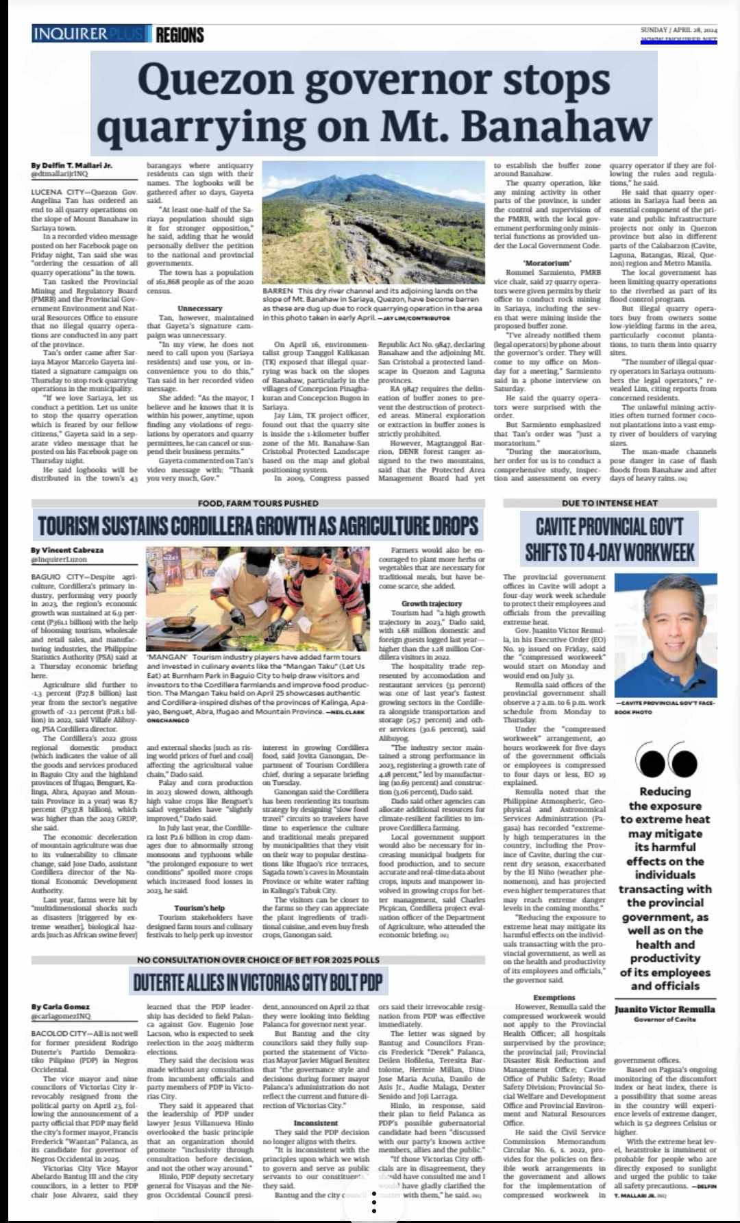 On April 26, 2024, Governor Helen Tan issued a moratorium order stopping all quarrying activities in Sariaya, Quezon. Governor Tan urges Mayor Gayeta to review the business permits he has issued in the permitted areas or permitted quarries of the PMRB to facilitate a comprehensive study towards the proper management of the natural resources of Sariaya, particularly in areas close to protected areas like Mount Banahaw.